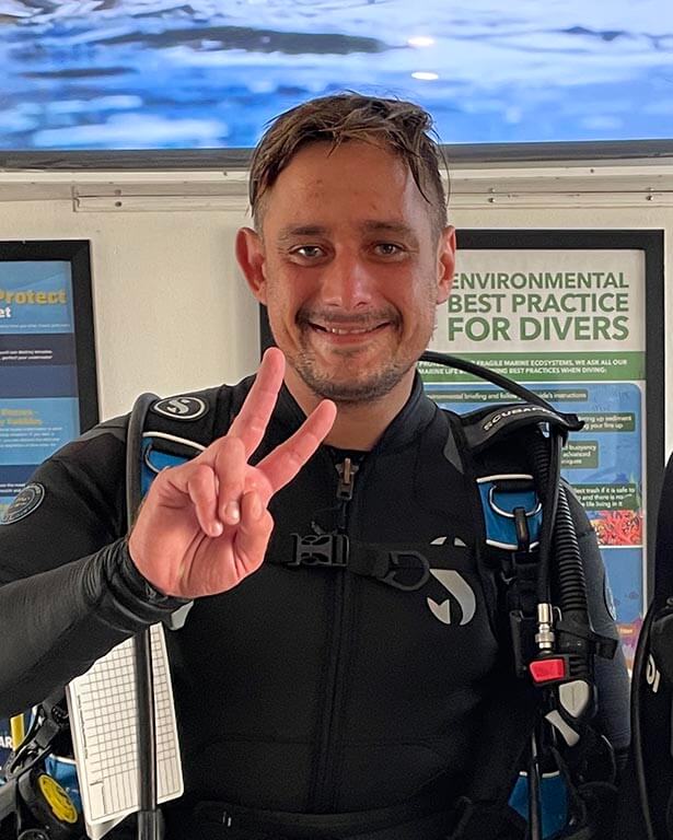Driven by his ambition to teach and inspire others, Fabio continued to Costa Brava in Spain, where he completed his Instructor training and officially became a certified Scuba Instructor. In the clear Mediterranean waters, he refined his teaching skills and helped students from all over the world take their first breaths underwater. Today, Fabio travels the world as a Dive Instructor, combining professionalism, patience, and a true love for the ocean. His teaching style is calm, supportive, and focused on safety — making students feel confident and comfortable from their very first pool session to their first open water dive.